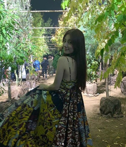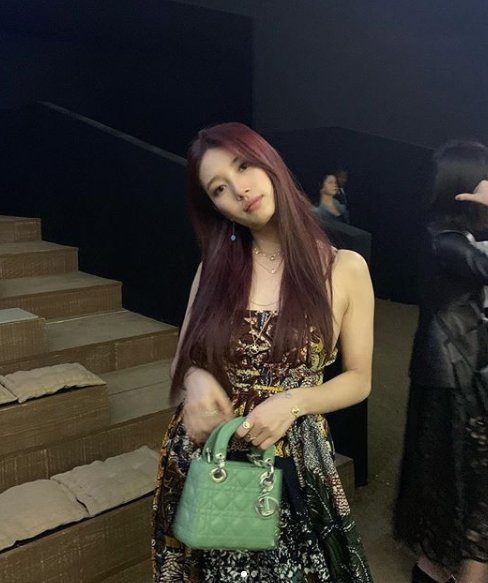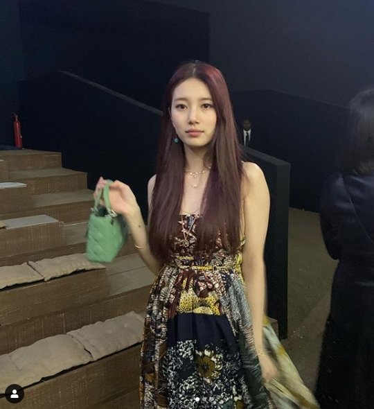 게재된 수지의 SNS사진을 살펴보면 오프솔더의 편한 드레스와 함께 초록색 가방이 인상적이다. 정원을 떠올리게 하는 행사장에서 수지는 즐거운 한때를 보내고 있는듯 하다.