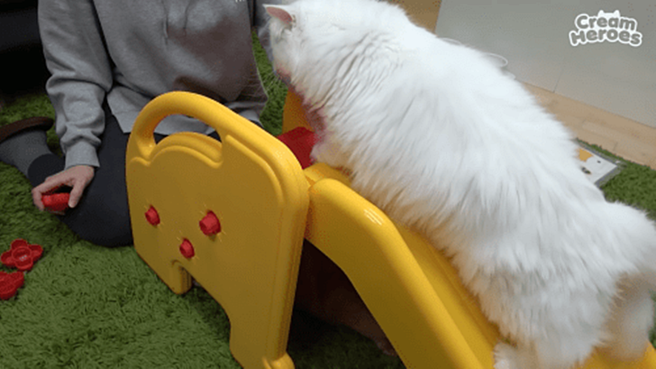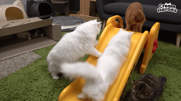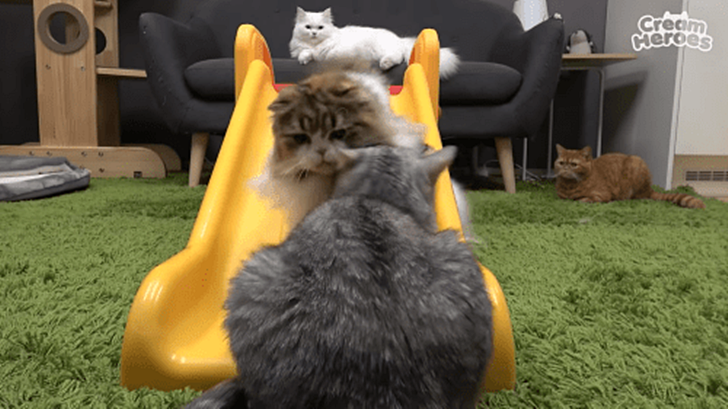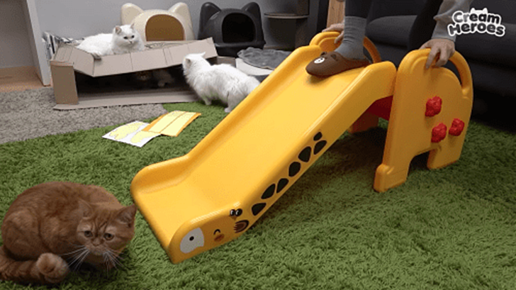 어떠세요? 유아용 미끄럼틀을 고양이들이 즐기고 있는 모습, 보고만 있어도 저절로 힐링이 되는 기분이 드는데요. 고양이들의 호기심은 정말 그 끝이 어디인지 알 수 없는 거 같습니다.