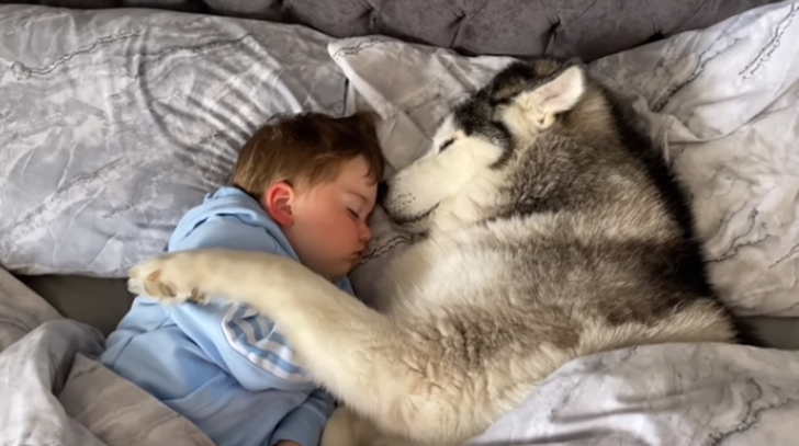 그리고 이내 네티즌은 허스키를 침대에서 나오도록 재촉을 하였다고 합니다. 하지만 허스키는 네티즌의 말을 듣지 않고 그대로 침대에 있었다고 하는데요. 그리고 이어지는 동영상속에서는 놀랍게도 허스키가 마치 어린 아이를 재우듯 한쪽 다리를 아이에게 올리고 편하게 잠들어 있었다고 합니다.