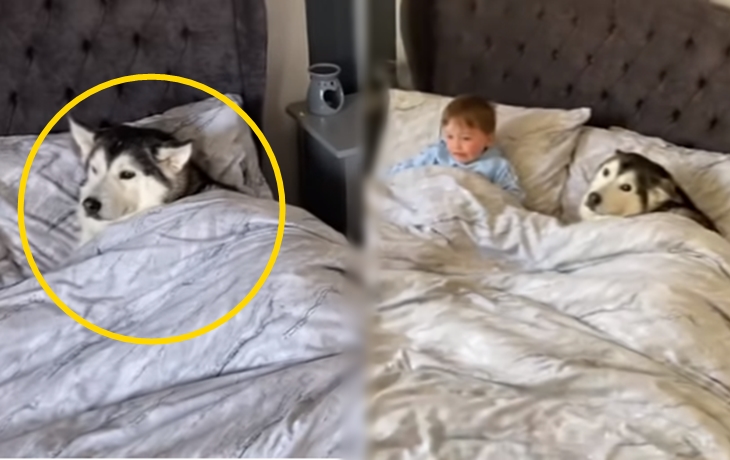어느날 동영상을 공유한 네티즌은 어린 아이를 데리고 침실로 갔다고 합니다. 그런데 이미 침실에는 네티즌이 키우고 있던 허스키가 마치 자신의 침대인것처럼 이불까지 덮고 점령을 하고 있었다고 하는데요.