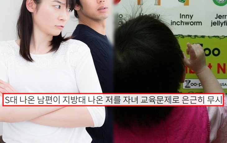 자녀를 교육하는 방식을 두고 부부간의 갈등이 생기는 부부들이 많아도 합니다. 한 여성자 역시 자녀의 교육문제를 두고 S대 출신의 남편이 지방대 출신인 자신을 무시하는 듯한 행동을 한다는 사연을 공유하면서 많은 네티즌들 사이에서 화제가 되고 있다고 합니다.