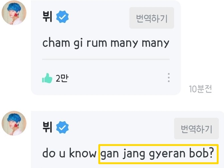 BTS의 공식 팬사이트인 위버스는 BTS 멤버들이 직접 전 세계 팬들과 소통을 하는 곳으로 직접 댓들을 통해 멤버들이 참여하는 곳으로 알려져 있습니다. 그런데 위버스를 통해 한 외국인 팬은 질문을 통해 "저는 한국 아미가 아니에요, 혹시 저에게 추천해주고 싶은 한국음식이 있다면 어떤 음식이에요?"라는 질문을 남겼다고 합니다. 이에 BTS '뷔'는 댓글을 통해 "do u know gan jang gyeran bob?, cham gi rum many many"라는 댓글을 남겼고, BTS 팬들 사이에서는 뷔가 남긴 음식의 정체를 파악하기 시작했다고 합니다.