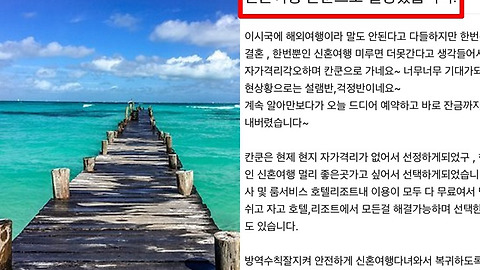 코로나19로 인해 많은 사람들이 일상적인 생활을 포기하는 경우들이 많습니다. 그중 하나가 바로 여행이죠. 최근 한 커뮤니사이트에는 신혼여행 관련 해외여행을 간다는 사연이 올라와 네티즌들 사이에서 갑론을박이 벌어지고 있다고 하는데요. 과연 어떤 내용일까요? 칸쿤은 멕시코의 가장 동쪽에 있는 킨타나로오주에 있는 해변 도시로 하와이와 더불어 신혼여행지로 각광을 받던 곳이었다고 합니다. 하지만 코로나19로 인해 해외 신혼여행이 어려워지면서 칸쿤 역시 관광객이 많이 줄었다고 하는데요. 그렇다 보니 관광객을 유치하기 위해 칸쿤에서는 코로나19 상황에도 불구하고 자가격리 없이 관광객들이 방문할 수 있도록 홍보를 하고 있는 중이라고 합니다. 그런데 최근 한 커뮤니케이션에서는 이런 칸쿤으로 신혼여행을 간다는 예비부부의 ..