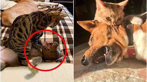 어떤 고양이와 개들은 너무 잘 지내서 보기만 해도 마음이 따뜻해지는 경우들이 있습니다. 하지만 반대로 서로 앙숙인 개와 고양이들도 있죠. 최근 SNS에서는 서로 앙숙인 개와 고양이들에 사진이 공유되 하제가 되고 있다고 하는데요. 그런데 공유된 사진을 자세히 보고 있으면 한 가지 이상한 부분들이 있다고 합니다. 바로 자신보다 덩치가 큰 개를 고양이가 괴롭히거나 고양이를 무서워하고 있는 개들이라는 점인데요. 도대체 어떤 사진들이 공유가 되었길래 '하룻고양이 개 무서운 줄 모른다'라는 말까지 생겨나고 있는지 웃픈 사진들을 한번 모아봤습니다. #1 #2 #3 #4 #5 #6 #7 #8 #9 #10 #11 #12 #13 #14